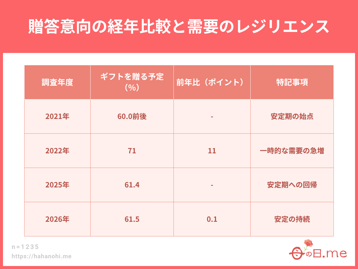 「今年の母の日にギフトを贈る予定」と回答した層は全体の61.5%に達しており、これは2025年度の61.4%とほぼ同等の水準である。