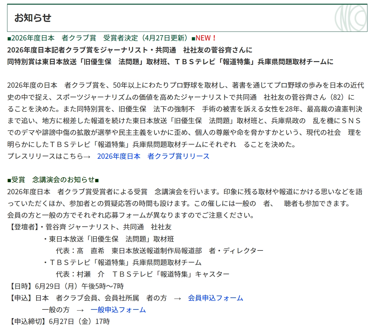 日本記者クラブ賞はジャーナリストの菅谷齊氏に 同特別賞は東日本放送「旧優生保護法問題」取材班、 TBSテレビ「報道特集」兵庫県問題取材チームに