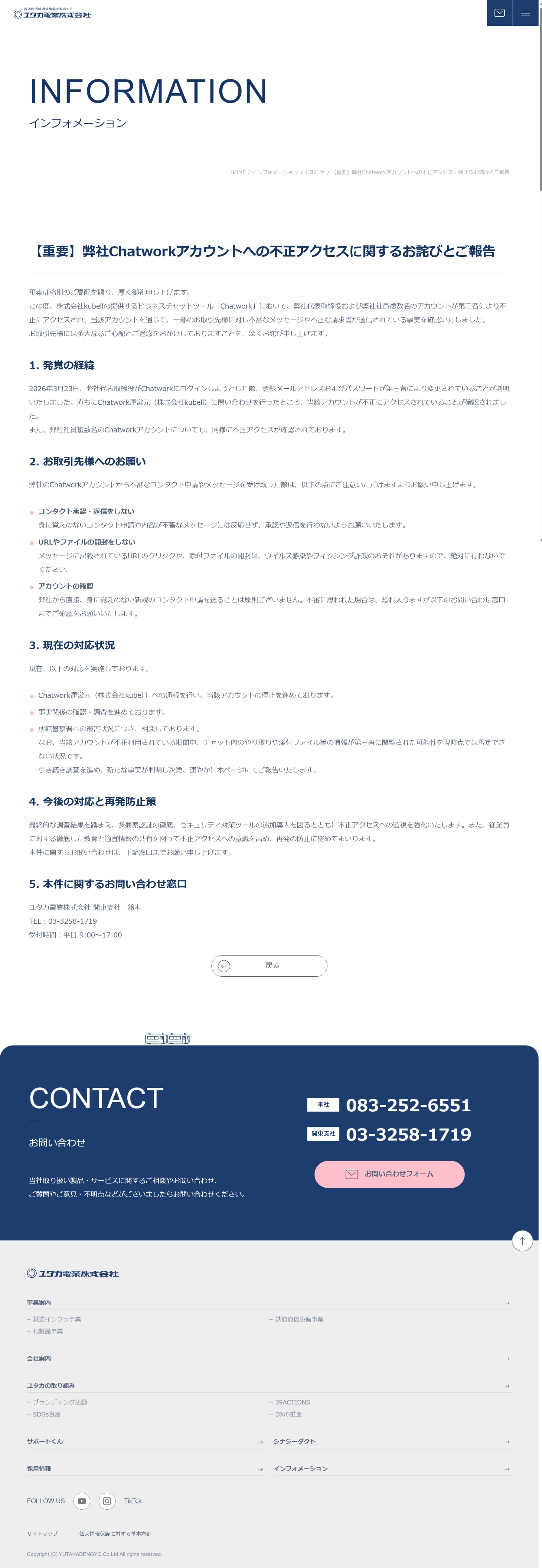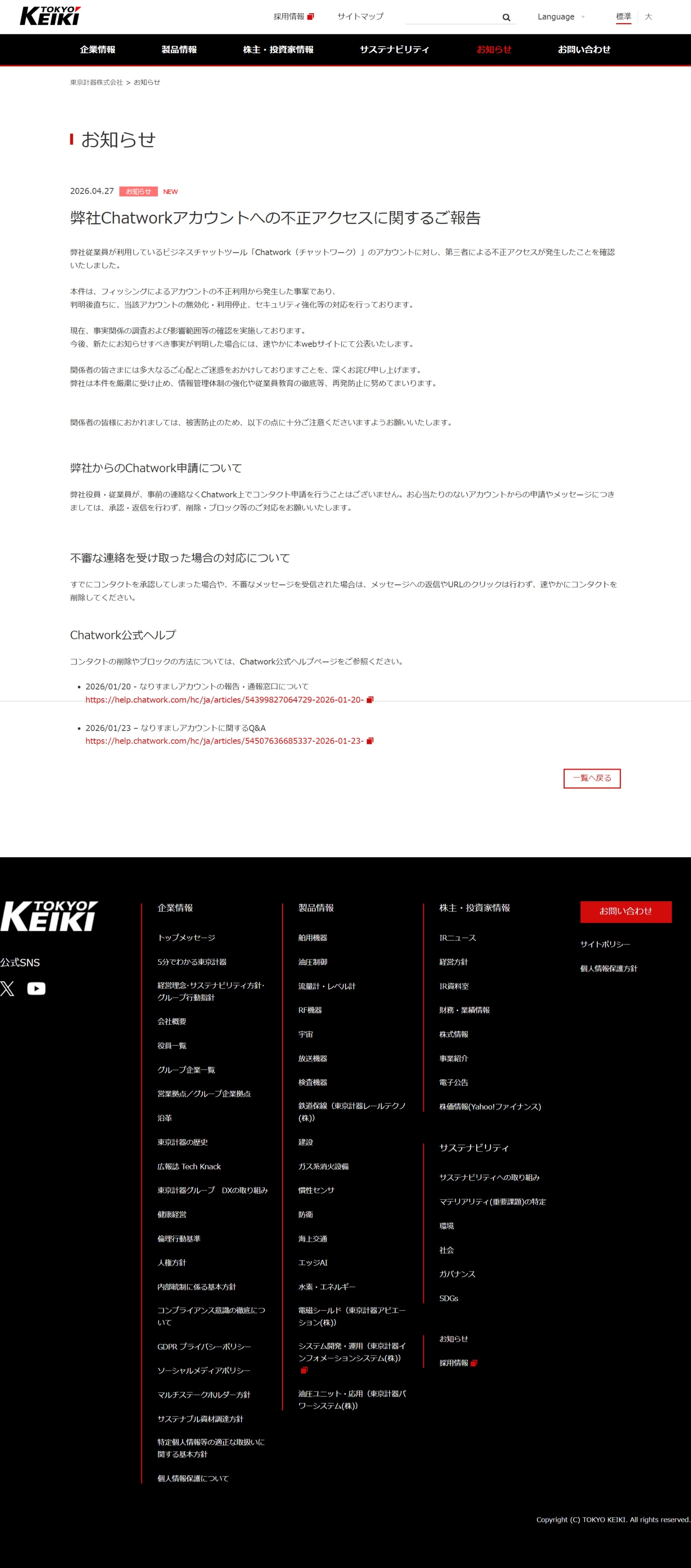 弊社Chatworkアカウントへの不正アクセスに関するご報告 | お知らせ | 東京計器株式会社