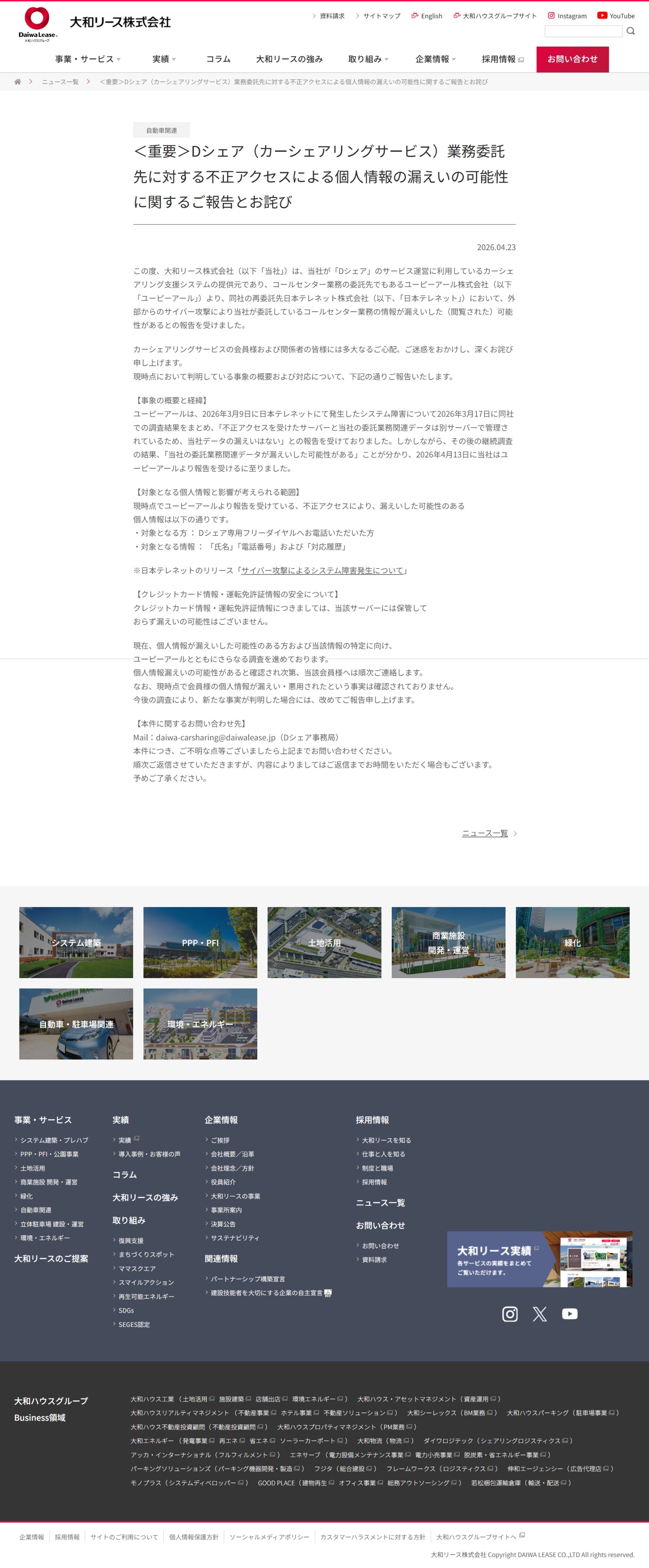 <重要>Dシェア(カーシェアリングサービス)業務委託先に対する不正アクセスによる個人情報の漏えいの可能性に関するご報告とお詫び