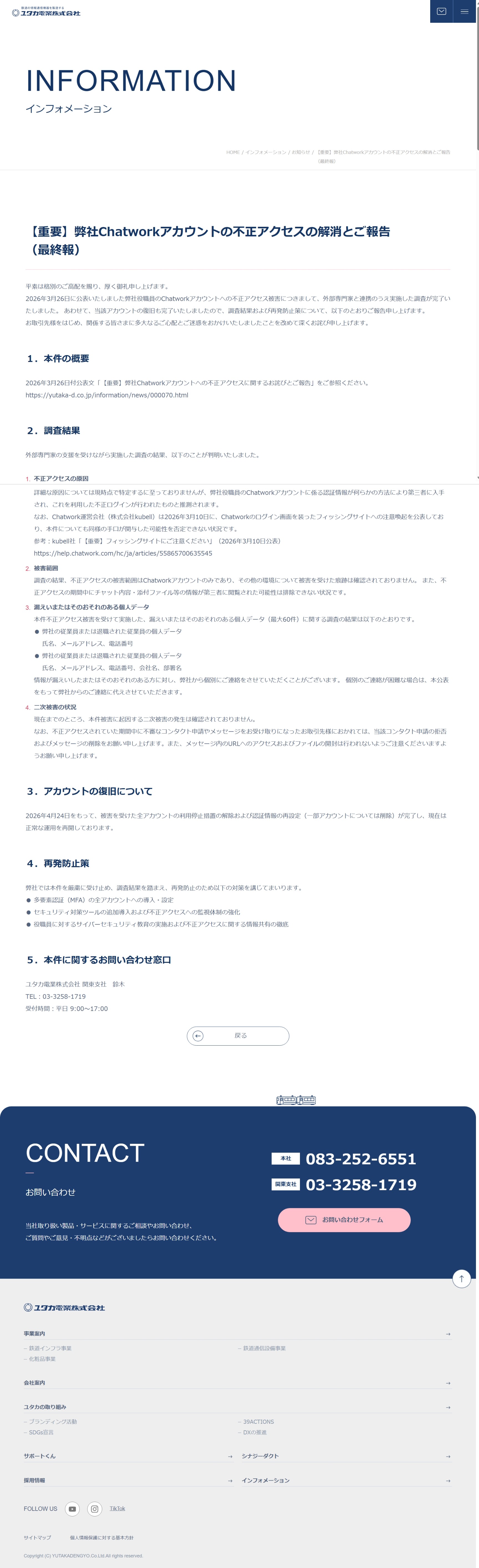 2026年3月26日に公表いたしました弊社役職員のChatworkアカウントへの不正アクセス被害につきまして、外部専門家と連携のうえ実施した調査が完了いたしました。 チャット内容・添付ファイル等の情報が第三者に閲覧された可能性は排除できない状況です。