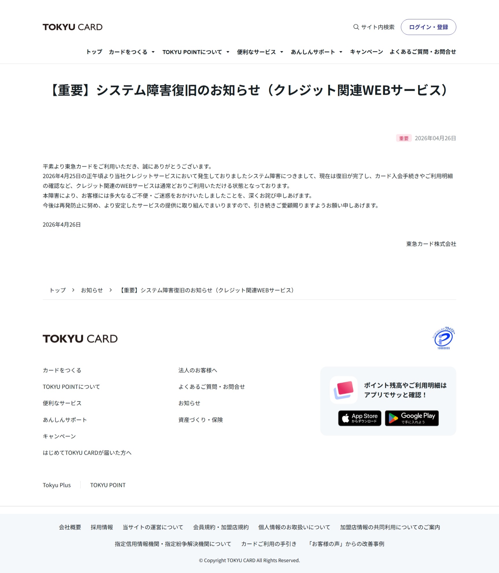 【重要】システム障害復旧のお知らせ(クレジット関連WEBサービス) | TOKYU CARD