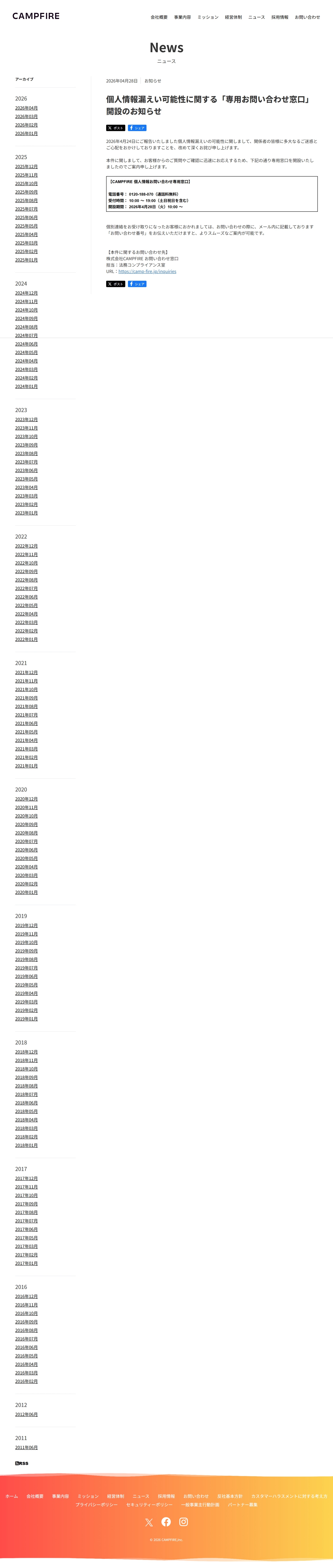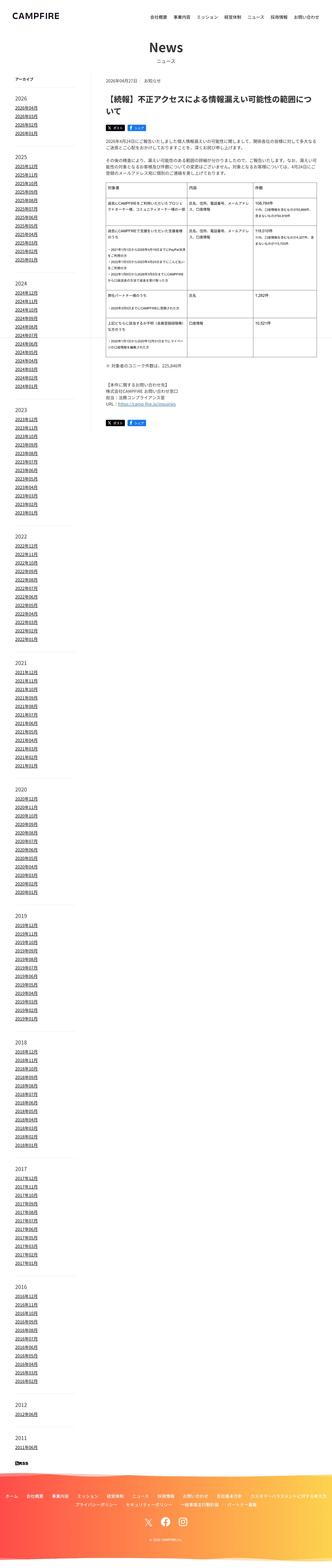 個人情報漏えい可能性に関する「専用お問い合わせ窓口」開設のお知らせ – 株式会社CAMPFIRE