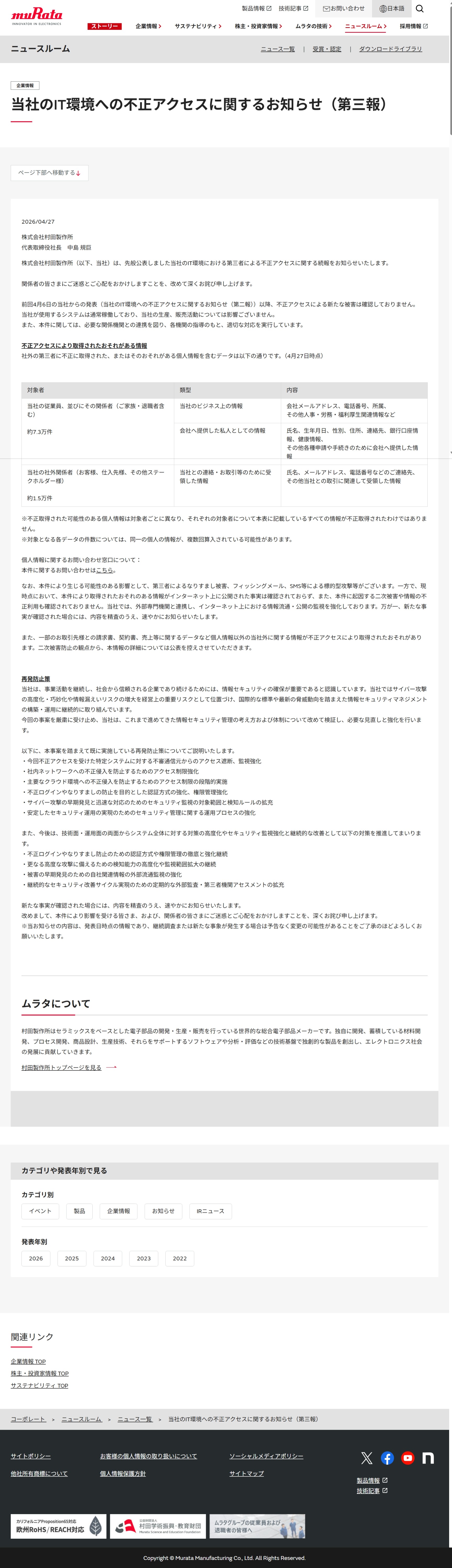当社のIT環境への不正アクセスに関するお知らせ(第三報) | 村田製作所