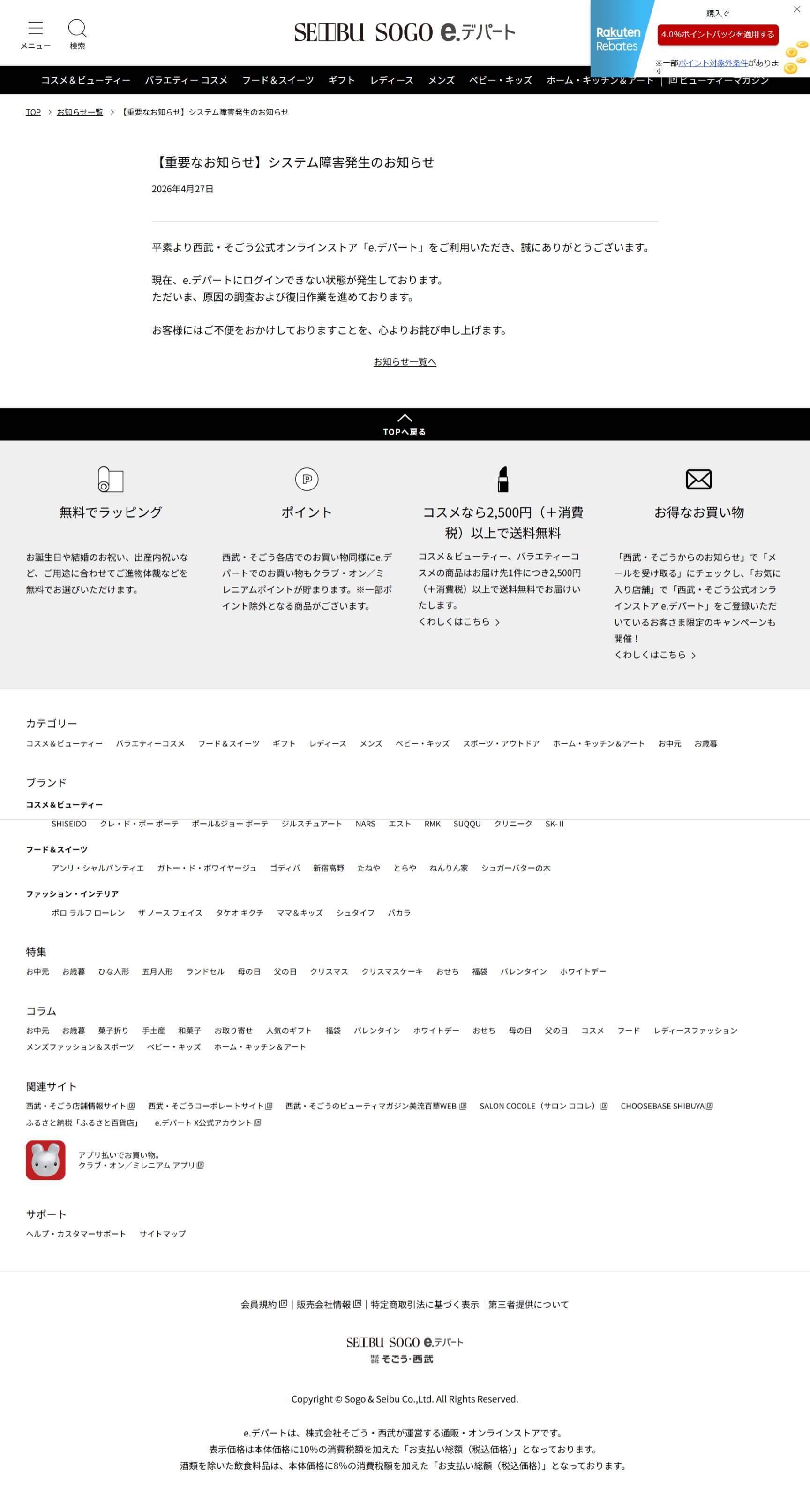 お知らせしておりました、e.デパートにログインできない状態が発生していた事象につきまして、現在は復旧し、通常どおりご利用いただける状態となっております。