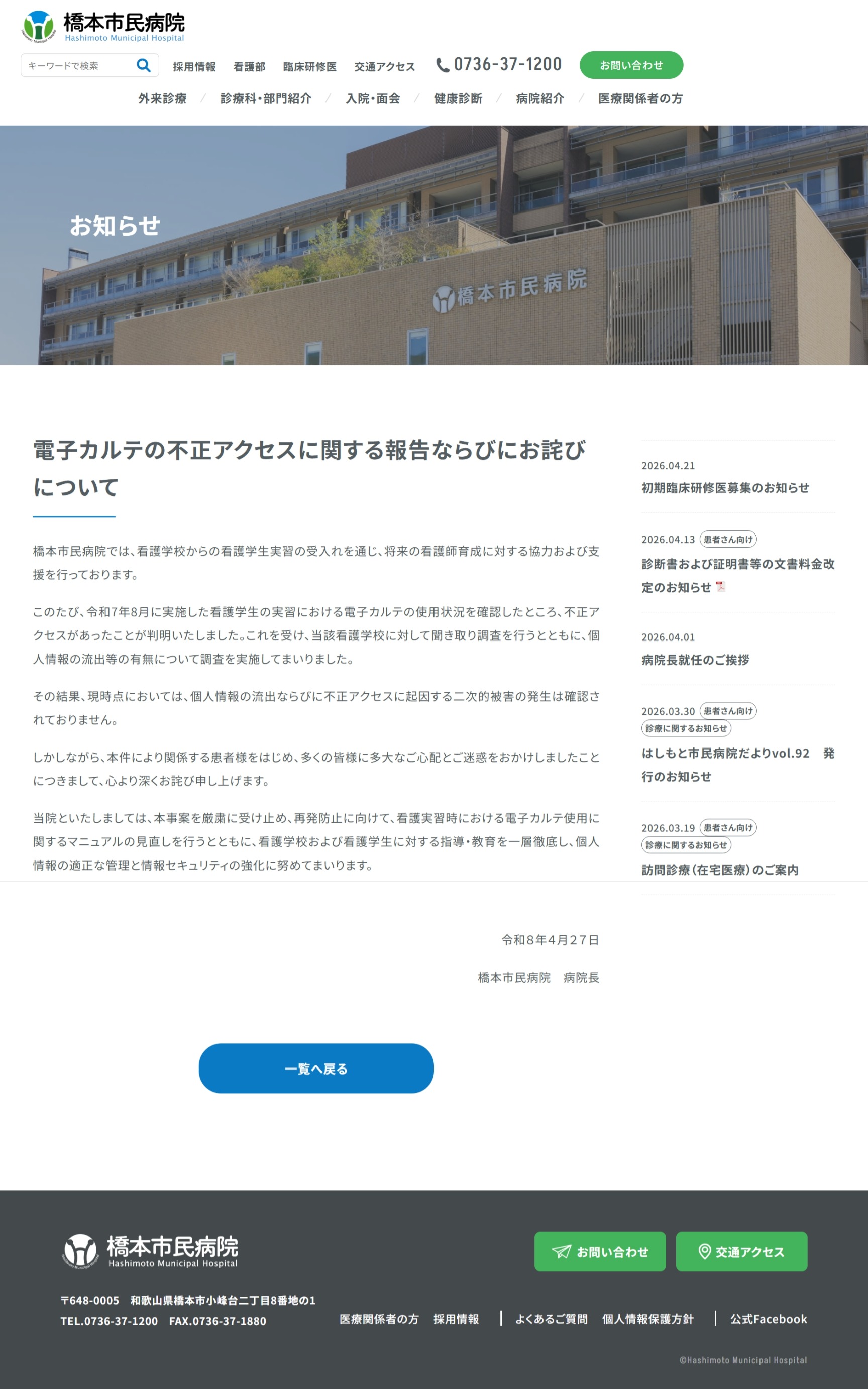 電子カルテの不正アクセスに関する報告ならびにお詫びについて|橋本市民病院