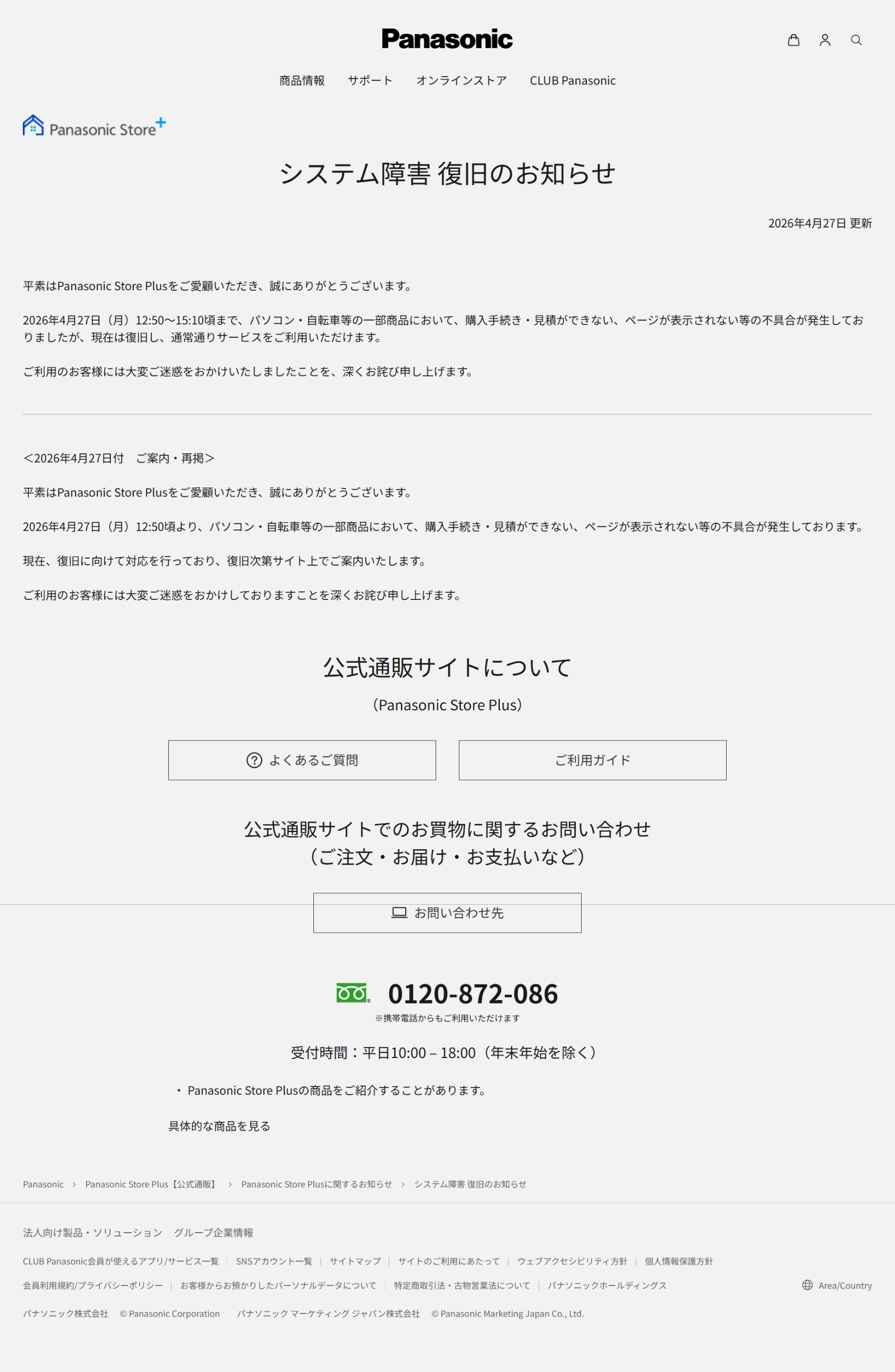 2026年4月27日(月)12:50~15:10頃まで、パソコン・自転車等の一部商品において、購入手続き・見積ができない、ページが表示されない等の不具合が発生しておりましたが、現在は復旧し、通常通りサービスをご利用いただけます。