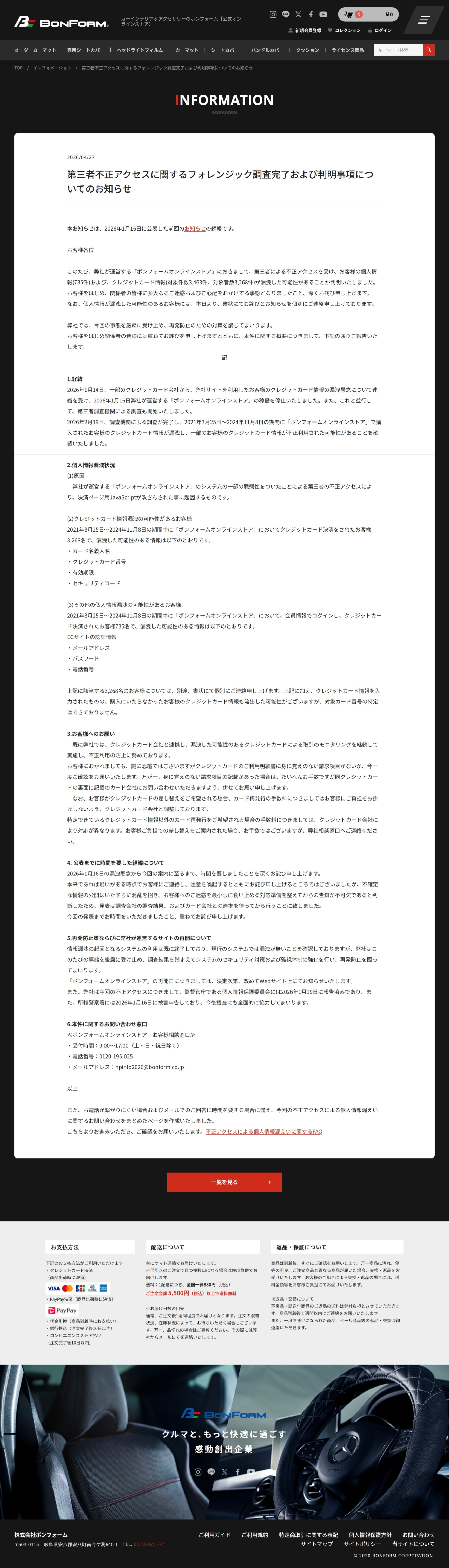弊社が運営する「ボンフォームオンラインストア」におきまして、第三者による不正アクセスを受け、お客様の個人情報(735件)および、クレジットカード情報(対象件数3,463件、対象者数3,268件)が漏洩した可能性があることが判明いたしました。