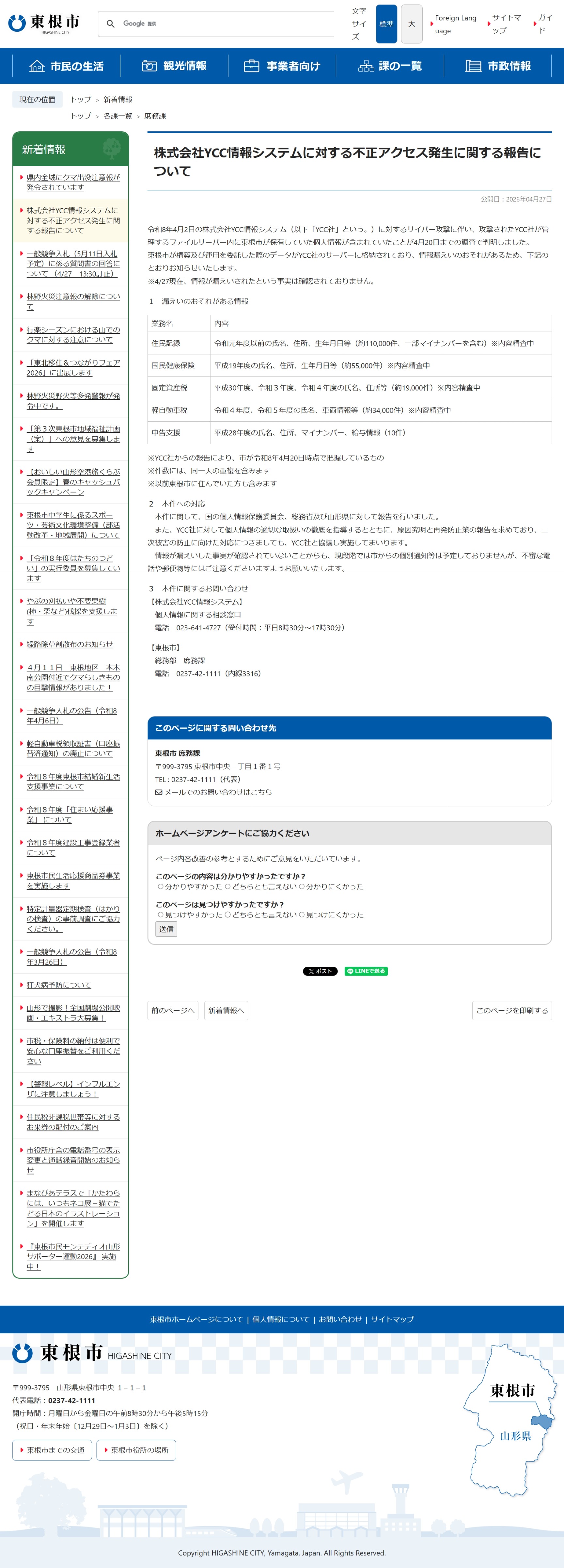令和8年4月2日の株式会社YCC情報システムに対するサイバー攻撃に伴い、攻撃されたYCC社が管理するファイルサーバー内に東根市が保有していた個人情報が含まれていたことが4月20日までの調査で判明しました。