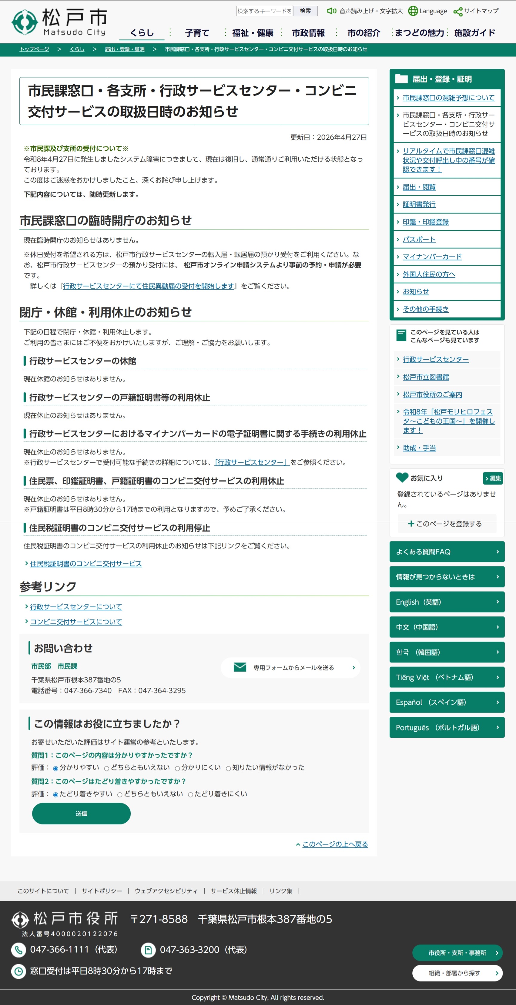 市民課窓口・各支所・行政サービスセンター・コンビニ交付サービスの取扱日時のお知らせ|松戸市