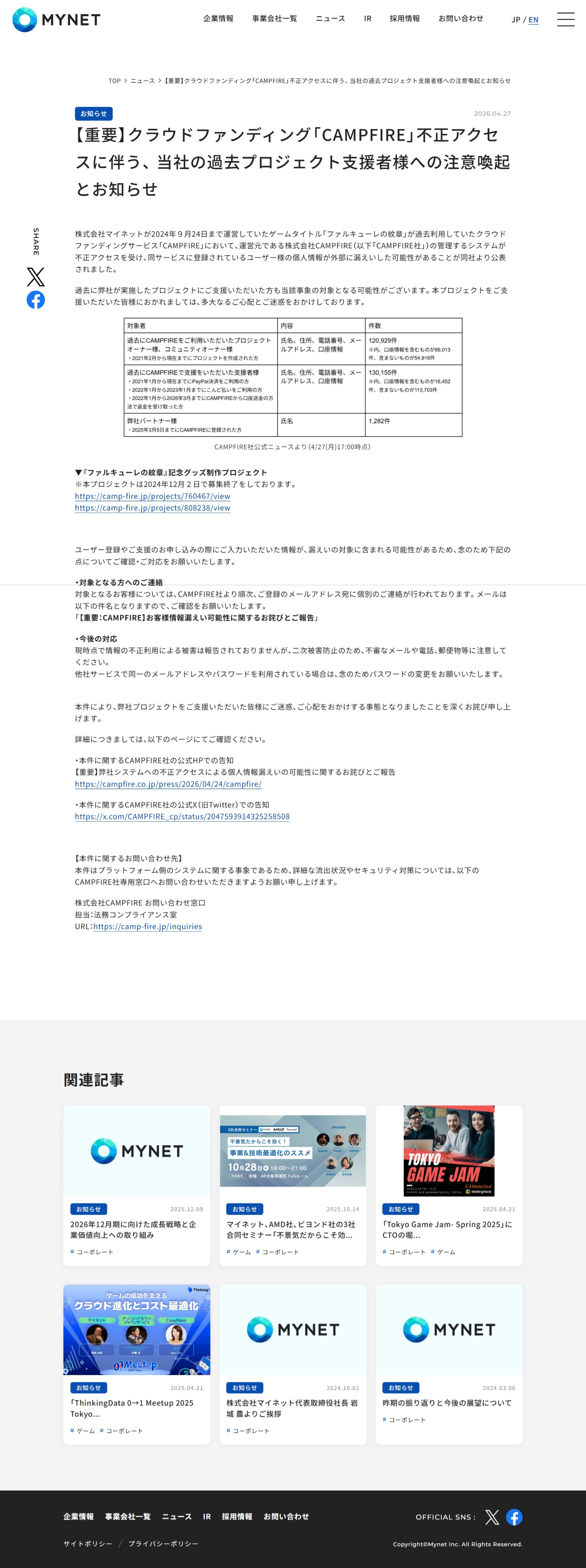クラウドファンディング「CAMPFIRE」不正アクセスに伴う、当社プロジェクト支援者様へのお知らせ | ニュース