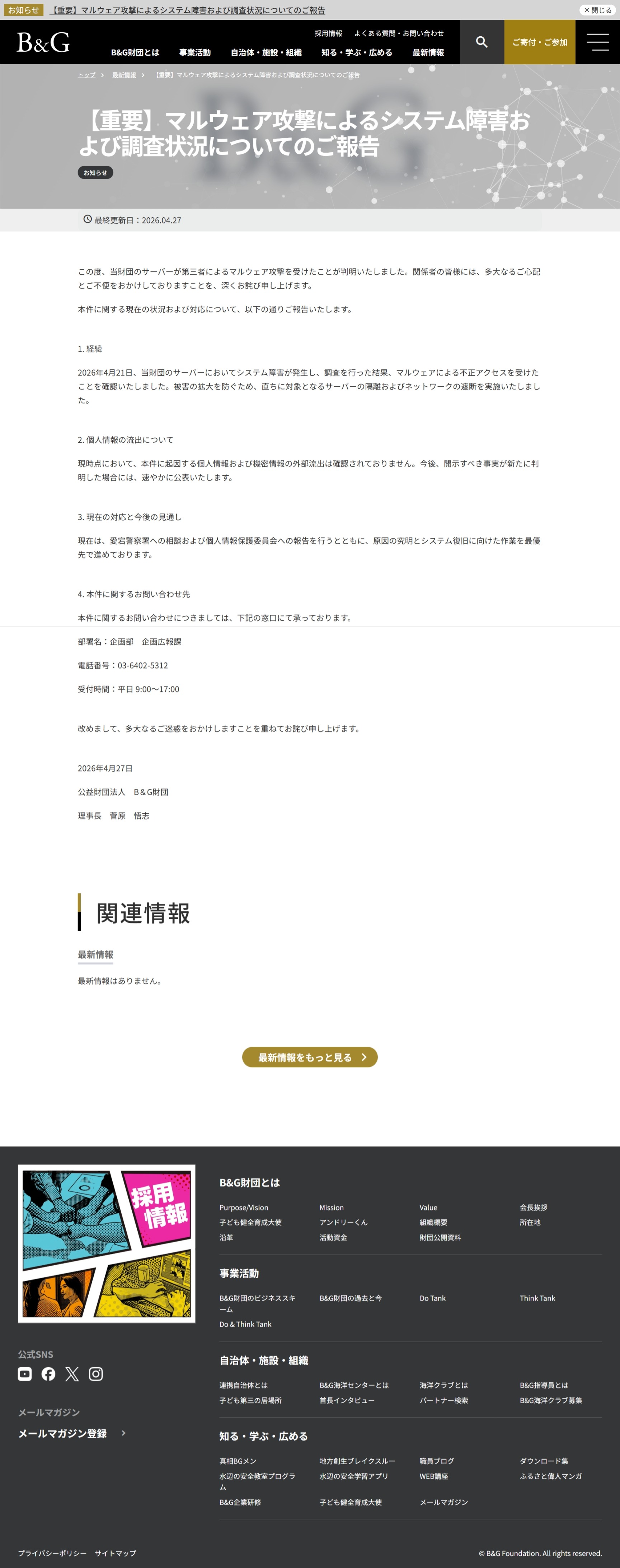 2026年4月21日、当財団のサーバーにおいてシステム障害が発生し、調査を行った結果、マルウェアによる不正アクセスを受けたことを確認いたしました。