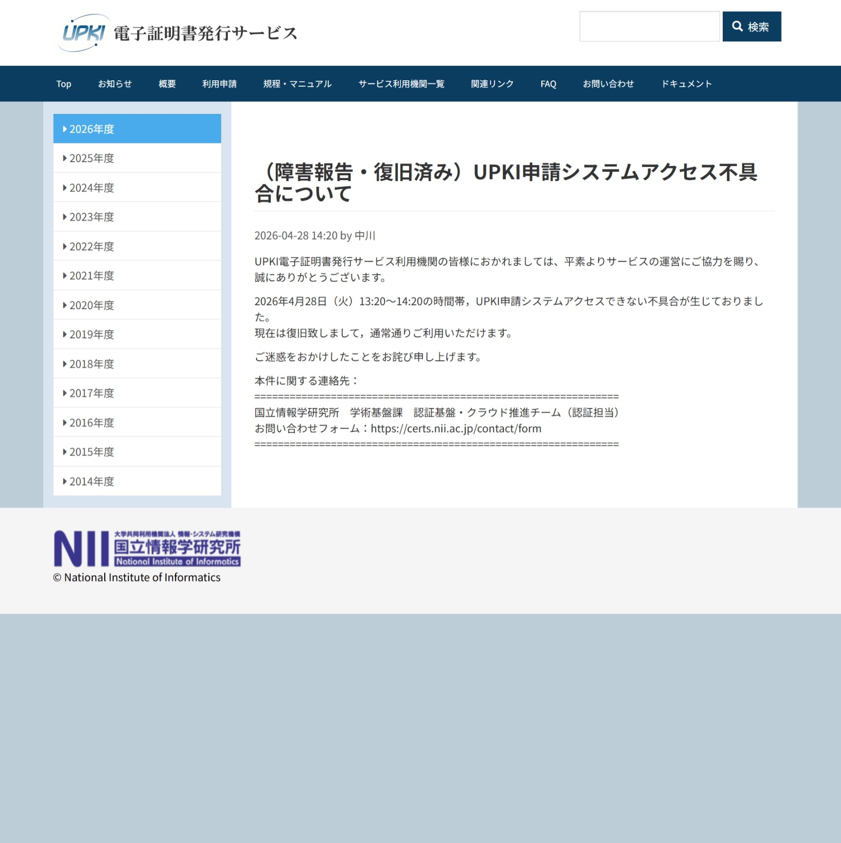 2026年4月28日(火)13:20~14:20の時間帯,UPKI申請システムアクセスできない不具合が生じておりました。現在は復旧致しまして,通常通りご利用いただけます。