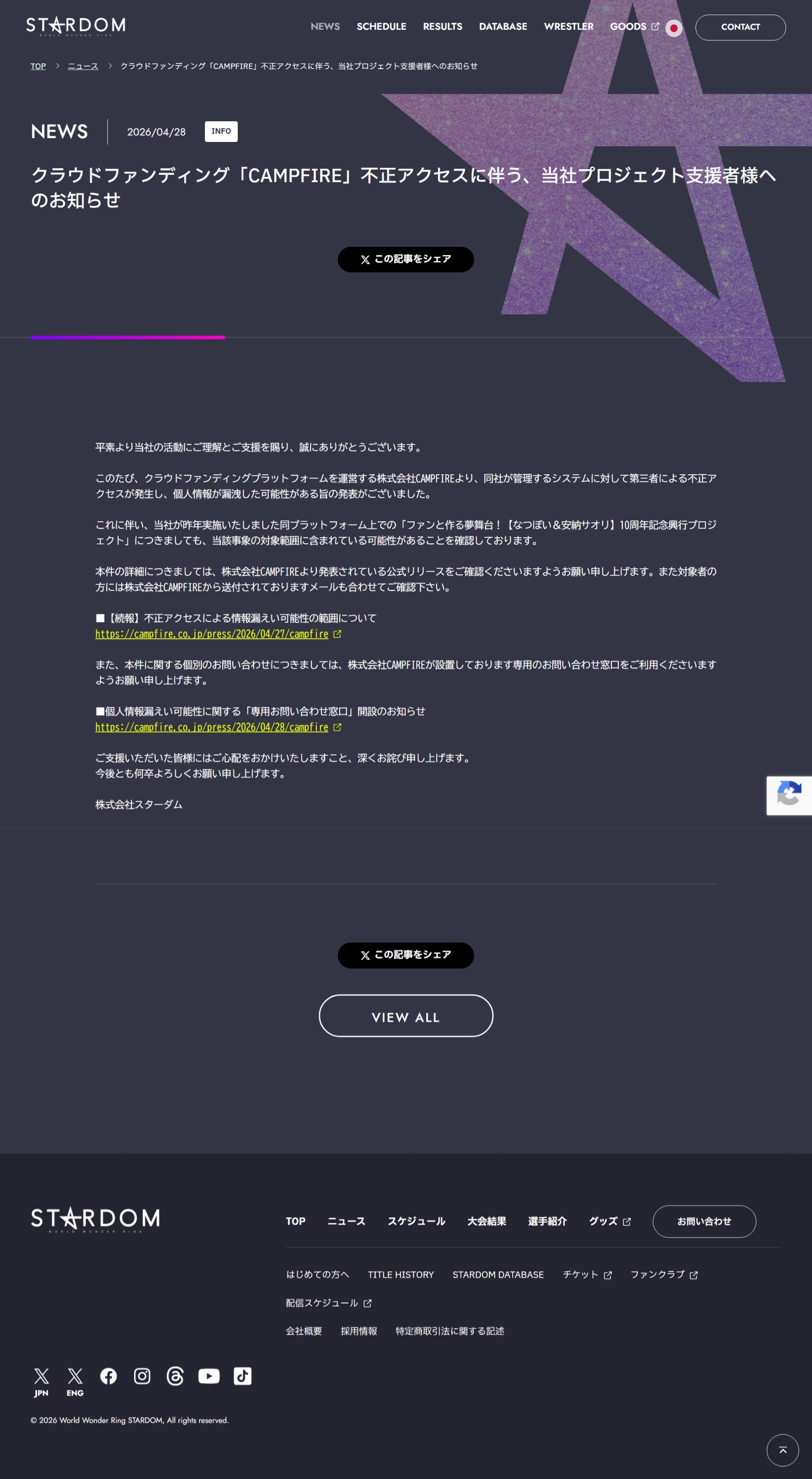 当社が昨年実施いたしました同プラットフォーム上での「ファンと作る夢舞台!【なつぽい&安納サオリ】10周年記念興行プロジェクト」につきましても、当該事象の対象範囲に含まれている可能性があることを確認しております。