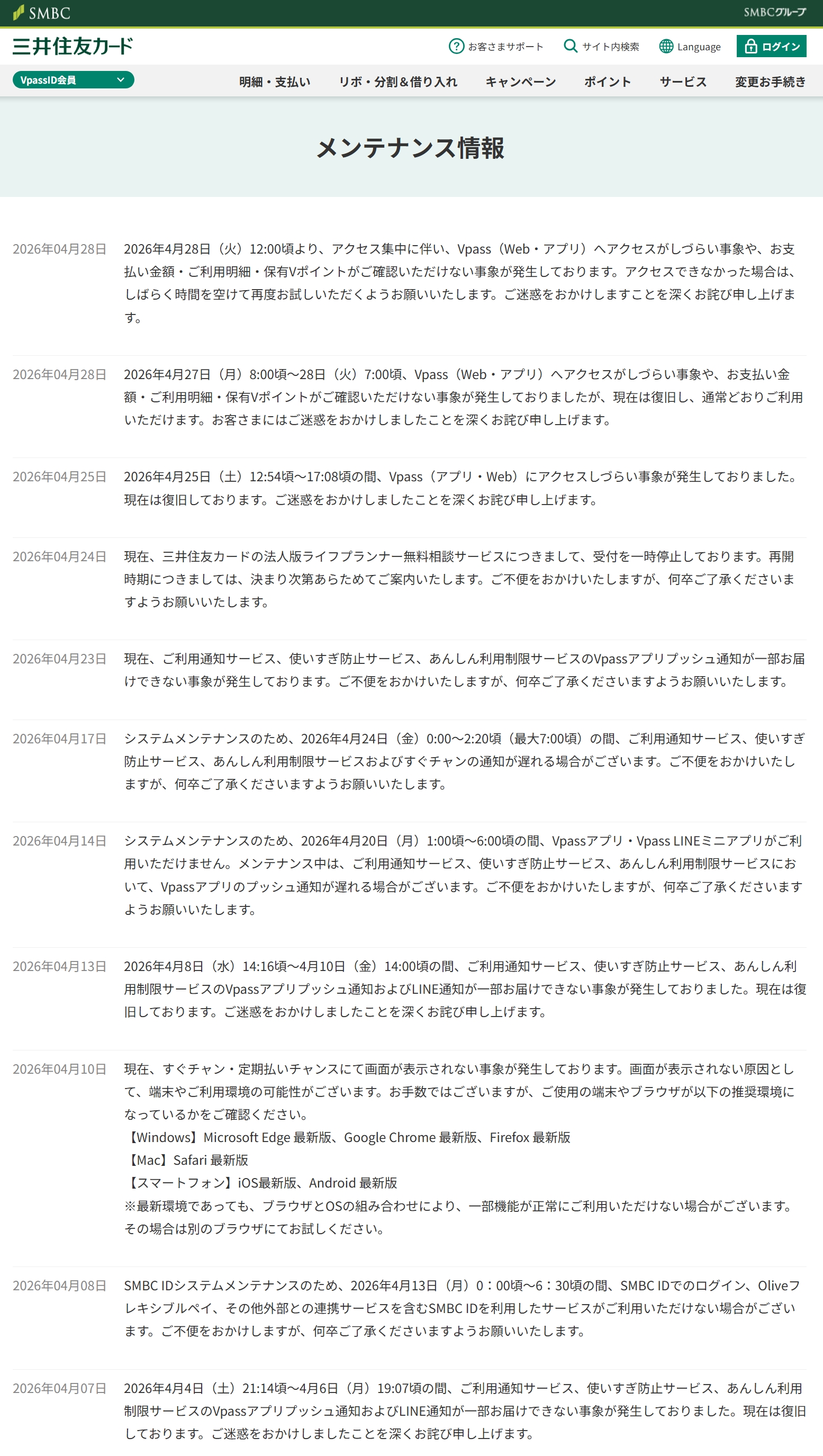 2026年4月25日の正午頃より当社クレジットサービスにおいて発生しておりましたシステム障害につきまして、現在は復旧が完了し、カード入会手続きやご利用明細の確認など、クレジット関連のWEBサービスは通常どおりご利用いただける状態となっております。