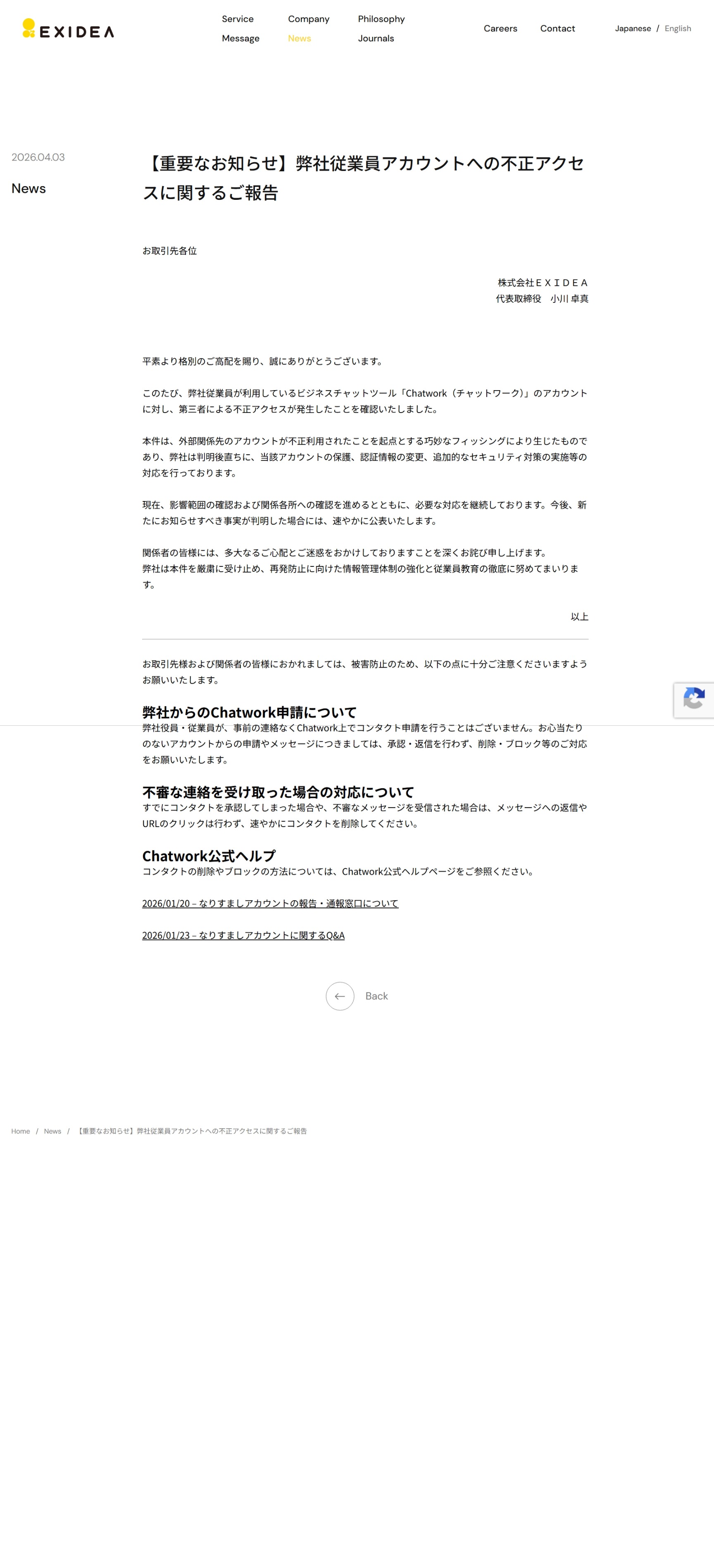 【重要なお知らせ】弊社従業員アカウントへの不正アクセスに関するご報告 – 株式会社EXIDEA