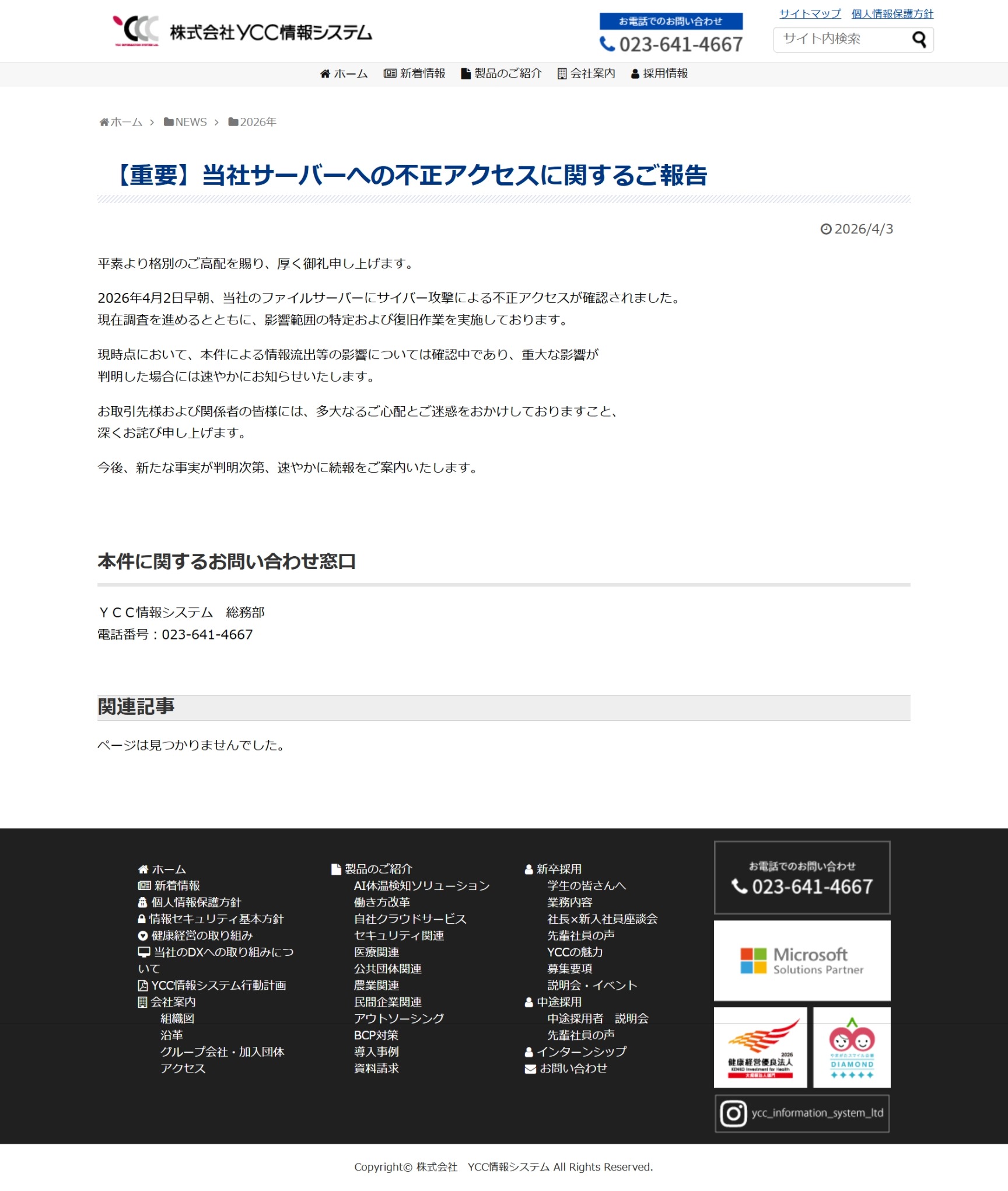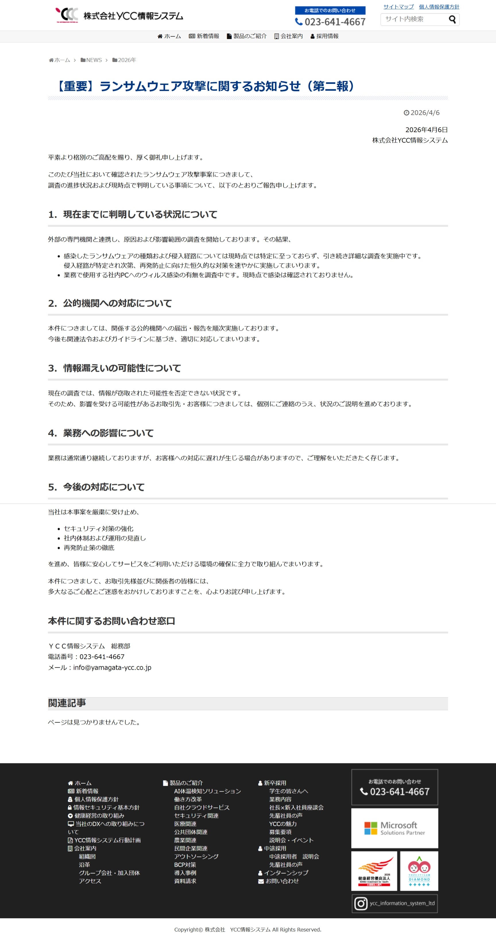 【重要】当社サーバーへの不正アクセスに関するご報告 | 株式会社 YCC情報システム