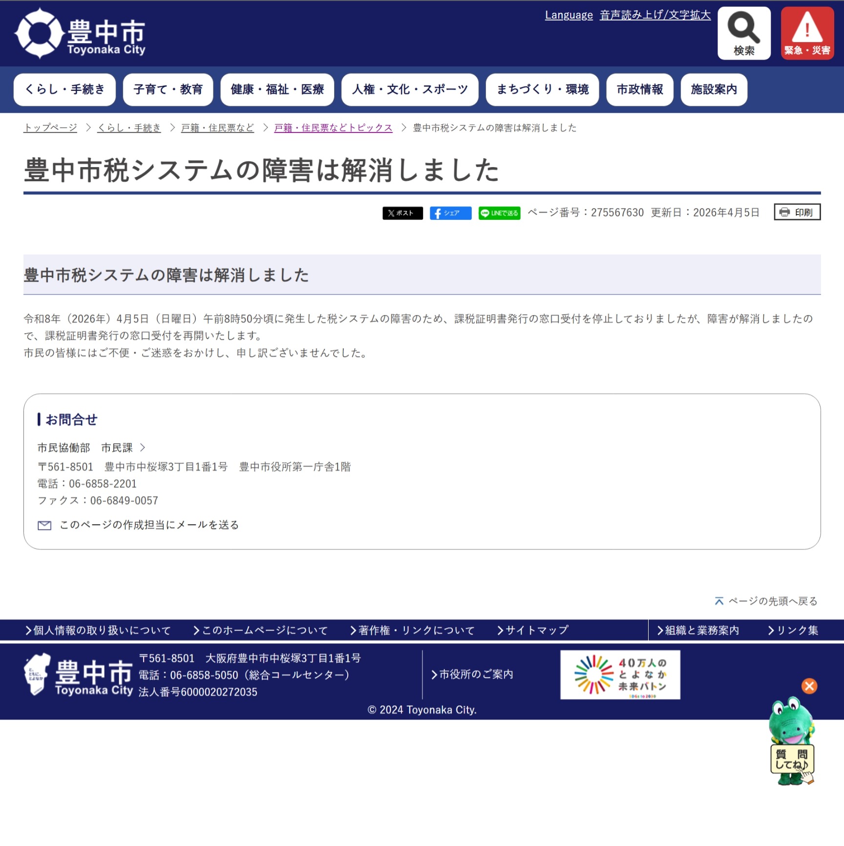 豊中市税システムの障害は解消しました