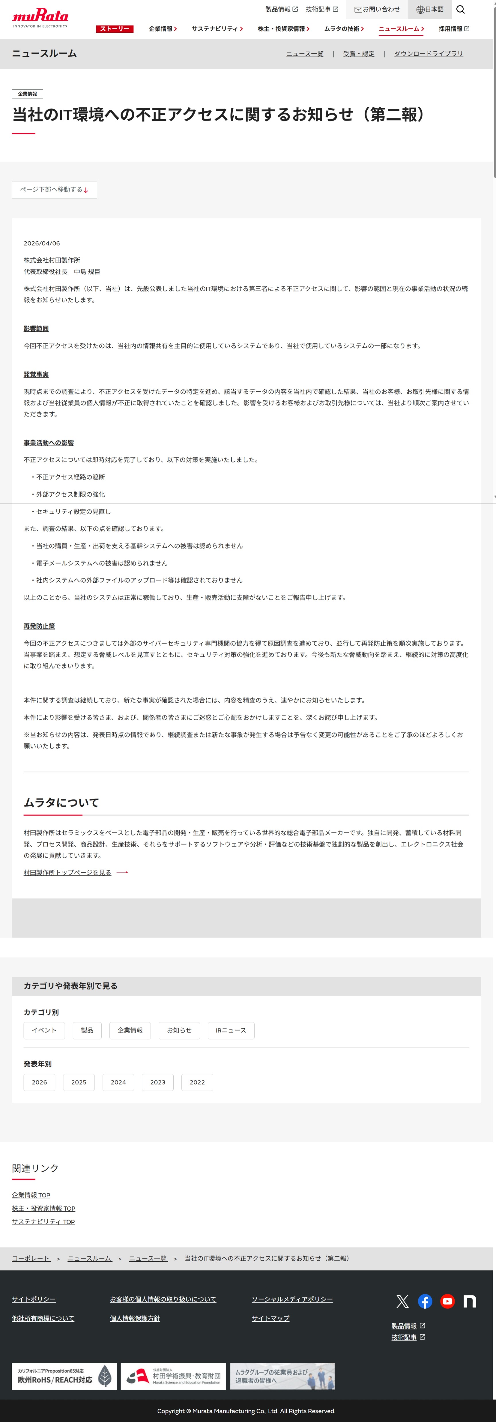 外部専門機関による調査の結果、第三者がシステム情報を閲覧した可能性が確認されましたが、現時点において、外部へのデータ転送やウェブコンテンツ、データベースへアクセスされた痕跡は確認されておりません。IT関連障害情報