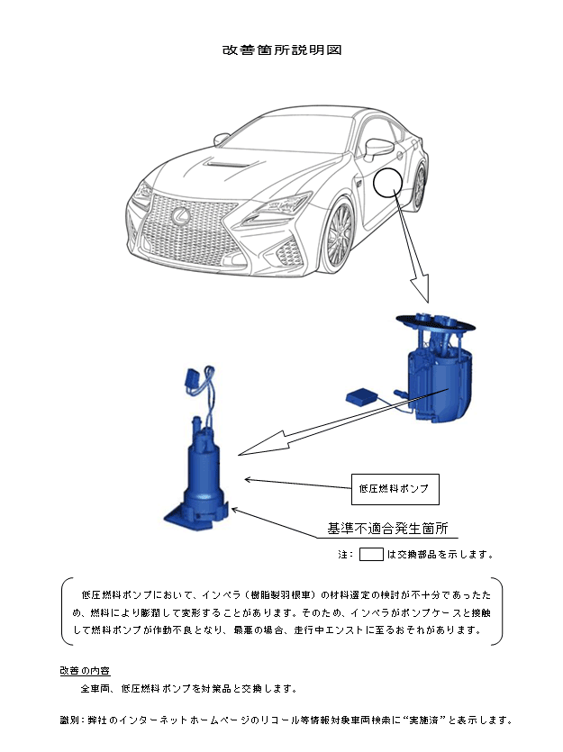 低圧燃料ポンプにおいて、インペラ(樹脂製羽根車)の材料選定の検討が不十分であったため、燃料により膨潤して変形することがあります。そのため、インペラがポンプケースと接触して燃料ポンプが作動不良となり、最悪の場合、走行中エンストに至るおそれがあります。