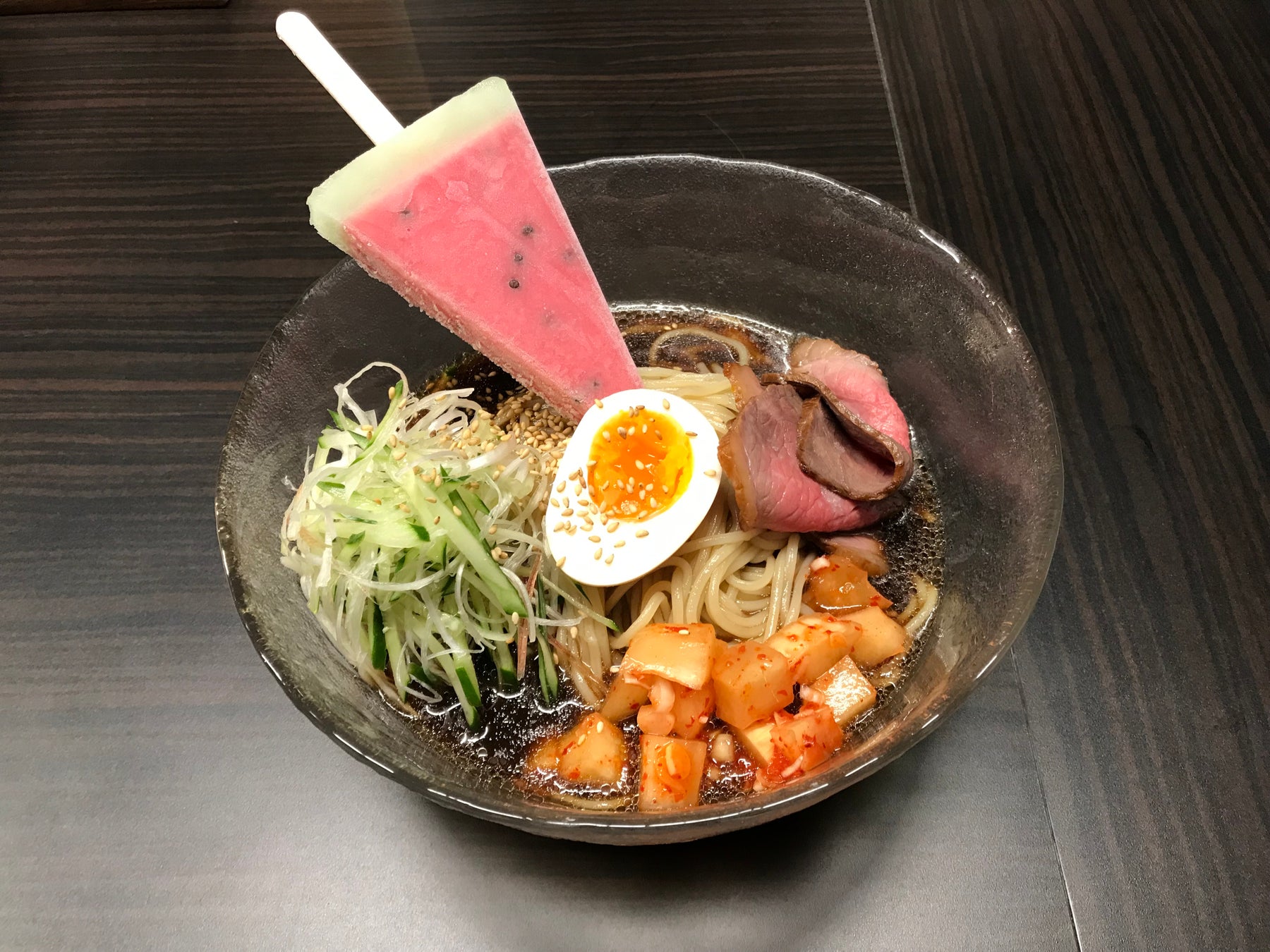 2023.07.24 発売 夏のアイス「スイカバー」×「麺屋武蔵」が夢のコラボ!夏にこそオススメしたい「念願のスイカラー」を麺屋武蔵 二天にて数量限定発売いたします。 7月24日発売
