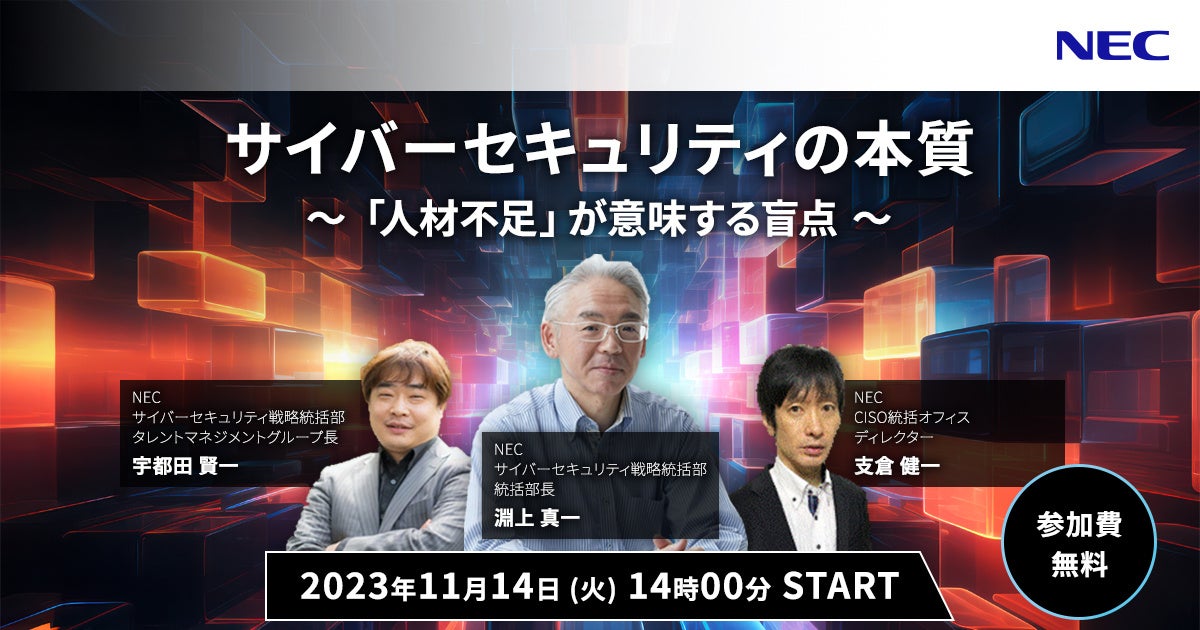 2023年10月18日 「NEC、「サイバーセキュリティの本質~「人材不足」が意味する盲点~」Webセミナー開催(11/14)」