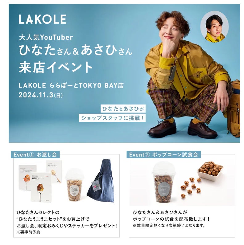 2024.10.09 人気YouTuber ”ひなた&あさひ” が11月3日(日)限定で LAKOLEららぽーとTOKYO-BAY店のショップスタッフに挑戦!