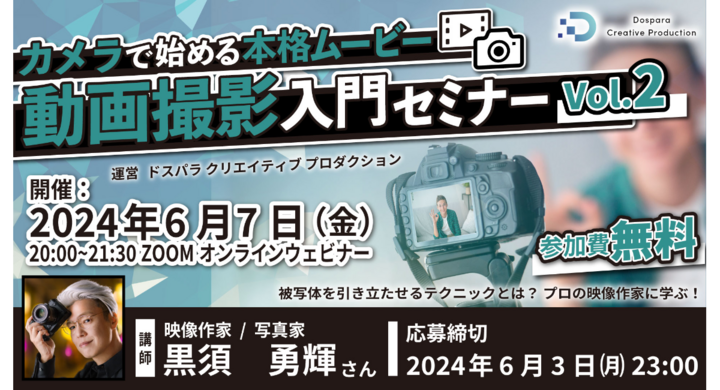 2024年5月24日 【ドスパラ】カメラで始める本格ムービー『動画撮影入門セミナーVol.2被写体を引き立たせるテクニック』6月7日(金)20時より開催 参加者募集中