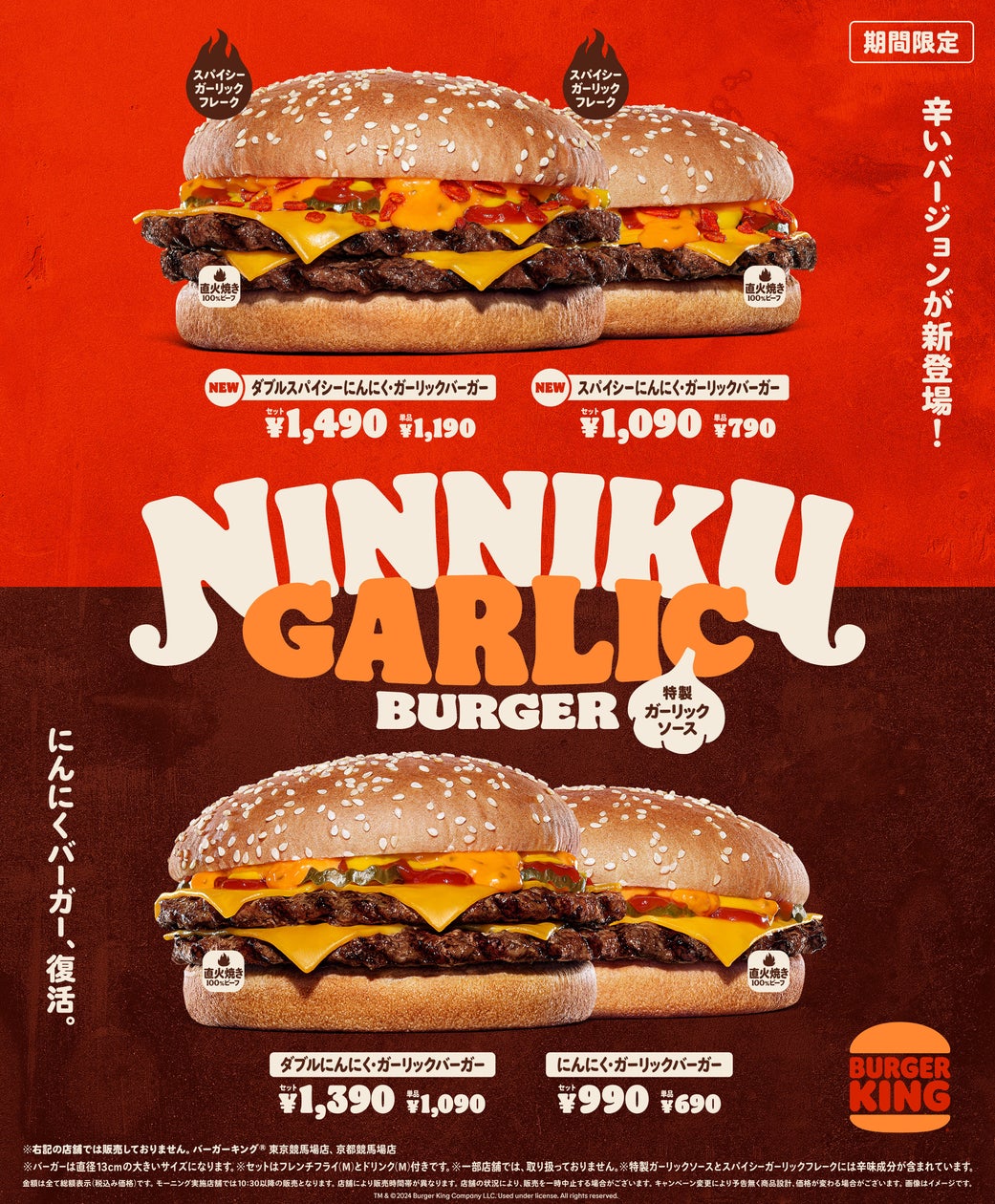 2024/09/12 昨年大ヒット話題作が復活!にんにくたっぷりの特製ガーリックソースと直火焼きビーフがクセになる 「にんにく・ガーリックバーガー」 スパイシーガーリックフレーク入りの「スパイシー」も新登場!/