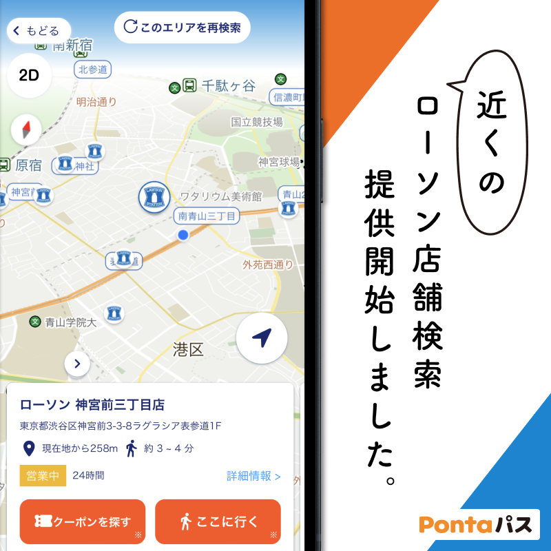 2024年10月15日 今いる場所から近くのローソン店舗を検索できる!Pontaパスアプリ内で店舗検索機能を追加 日本最大級のナビゲーションサービス「NAVITIME」と連動して店舗へのルートや使えるクーポンを無料で表示