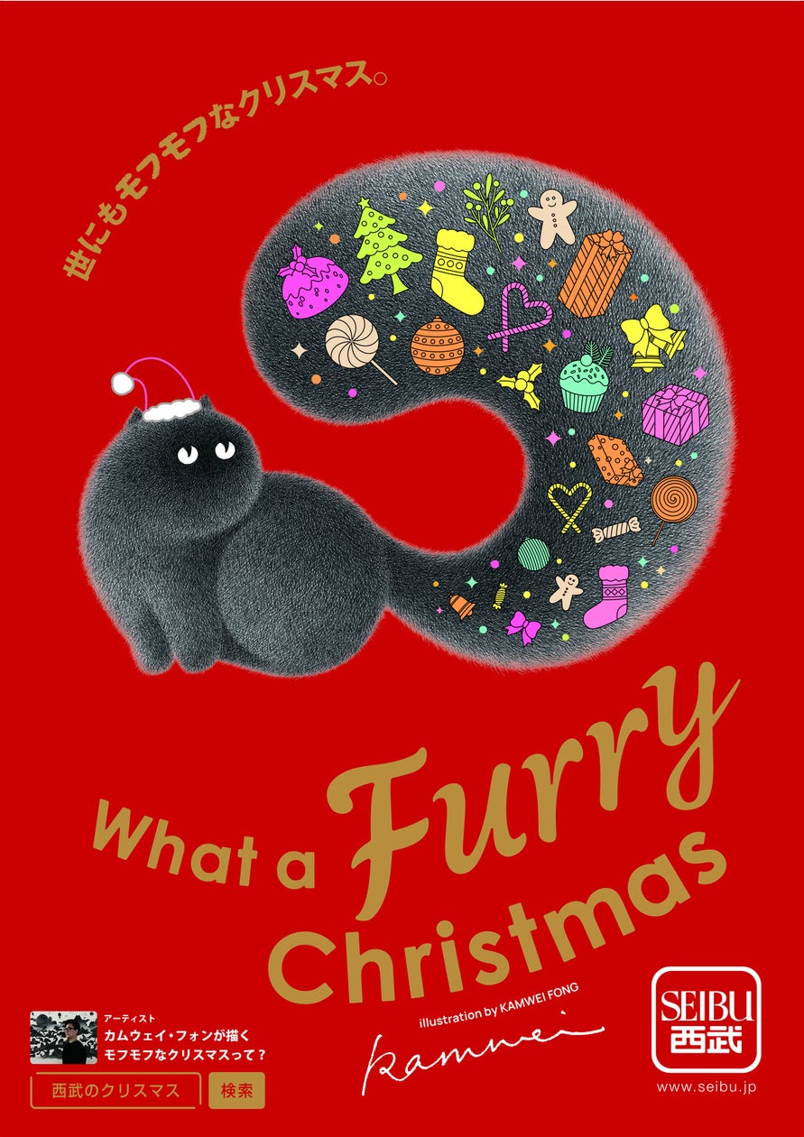 そごう・西武は2024年のクリスマスプロモーションにカムウェイ・フォン氏を起用。「What a Furry Christmas 世にも モフモフなクリスマス」をテーマに、思わず触れたくなるような愛らしい、心癒される「モフモフ」の魅力で、誰にとっても特別なクリスマスを盛り上げます。カムウェイ・フォンのアートワークは各店の店頭VPなどで表現されるほか、この時期限定の紙袋やギフトラッピングの包装紙、各種お買いあげプレゼントも登場。カムウェイ・フォンが描くモフモフからイメージした猫に関するお客さま参加型の店頭イベントやXキャンペーンも開催。その他、クリスマスギフトはもちろん、クリスマスシーズンに自分用のプレゼントとして需要の高いクリスマスアクセサリーやコフレ、コートなどもピックアップしてご紹介いたします。