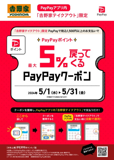 2024年5月1日 11時00分 PayPayアプリ「吉野家テイクアウト」限定、PayPayポイント最大5%付与キャンペーンを本日より開始