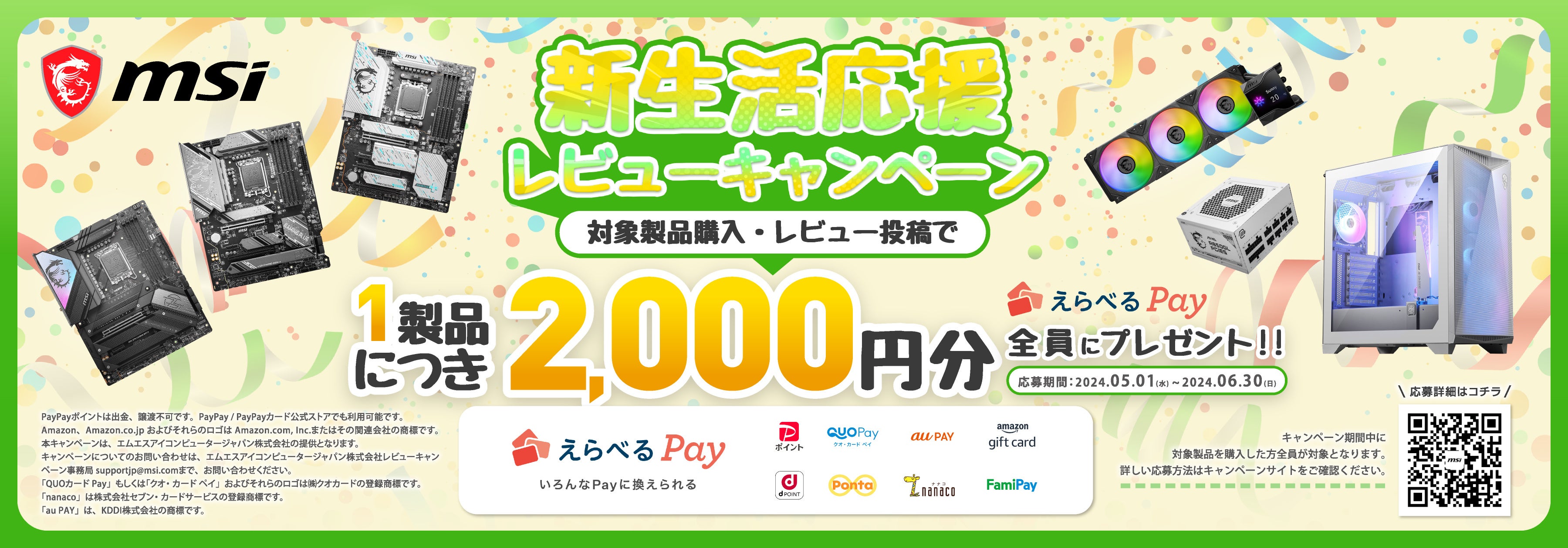 MSI、対象のチップセット搭載マザーボードや一部のMSI 簡易水冷クーラー・電源・PCケースを購入後、指定サイトにレビューを投稿した全員に2,000円分のえらべるPayが必ずもらえる!