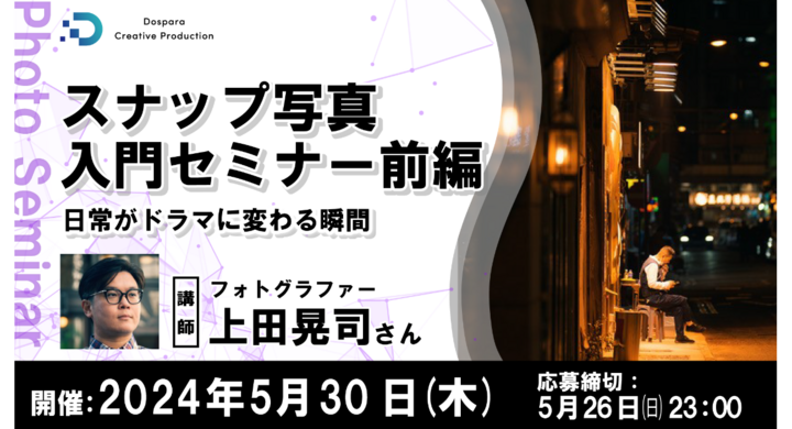 2024年5月16日 【ドスパラ】プロが教えるスナップ撮影の極意『スナップ写真入門セミナー前編 日常がドラマに変わる瞬間』5月30日(木)20時より開催 参加者募集中