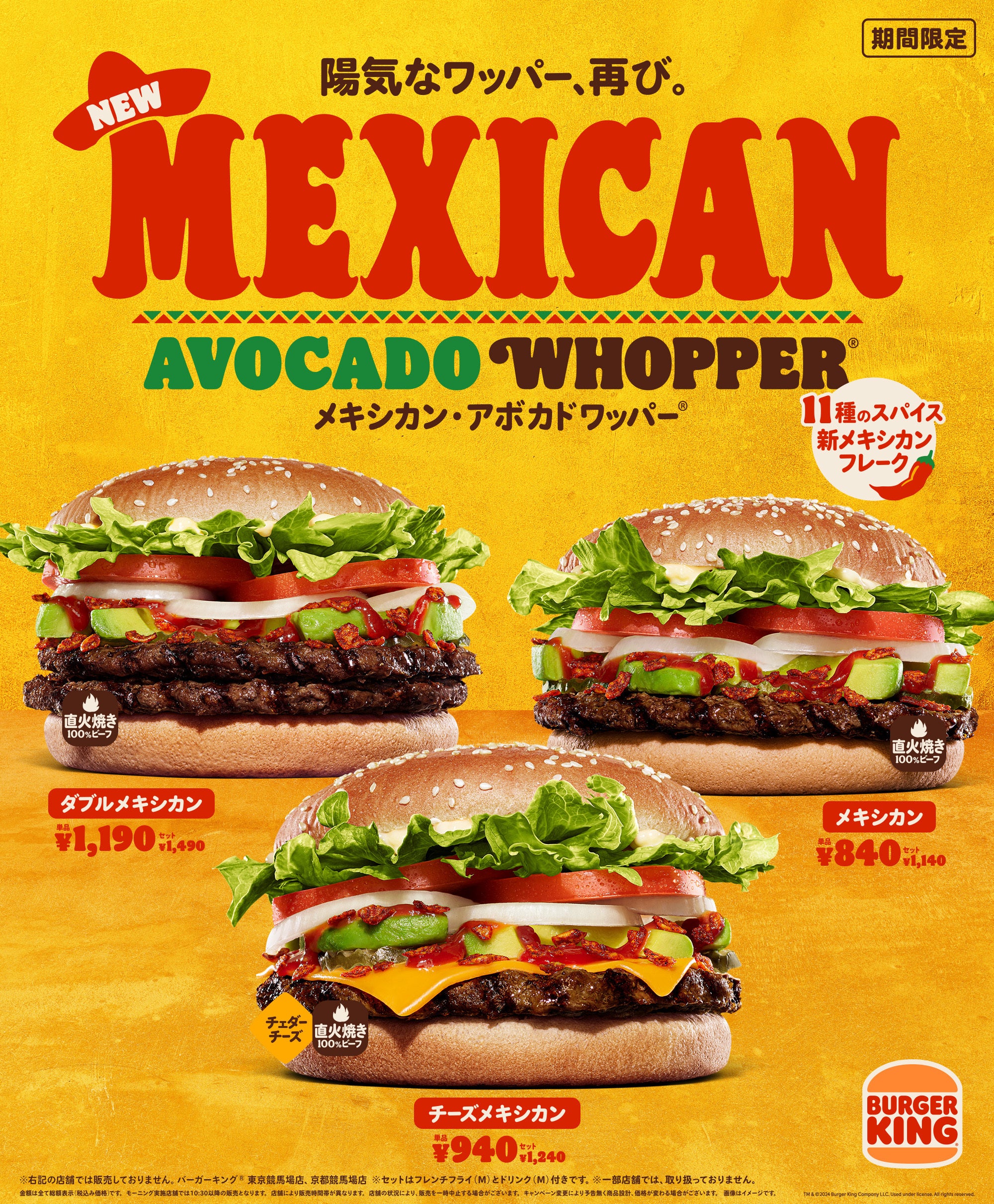 2024年5月16日 バーガーキングの「メキシカン・アボカドワッパー」が復活!直火焼きビーフとアボカドに、進化したスパイス11種の本格ピリ辛メキシカンフレークが相性抜群!「メキシカン」「チーズ」「ダブル」3種から選べる