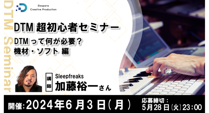 2024年5月20日 【ドスパラ】 『DTM超初心者セミナー』 機材・ソフト編 講師に 「スリープフリークス」 加藤 裕一氏が登壇 6月3日(月)20時より開催 参加者募集中