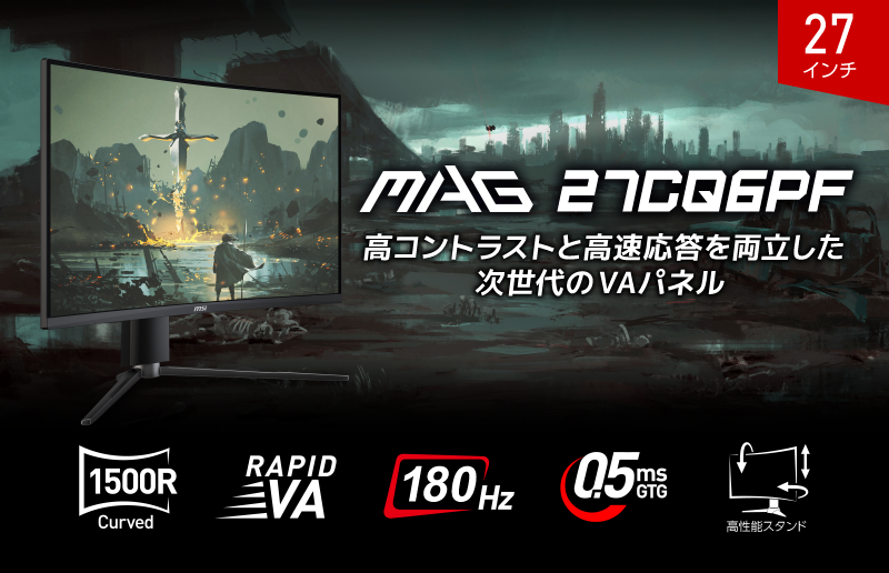 2024年5月24日 人気の27インチ・WQHDで高精細な映像を求めるゲーマーに最適湾曲率1,500R・180Hz・0.5ms(GTG)・高性能スタンド搭載「MAG 27CQ6PF」発売