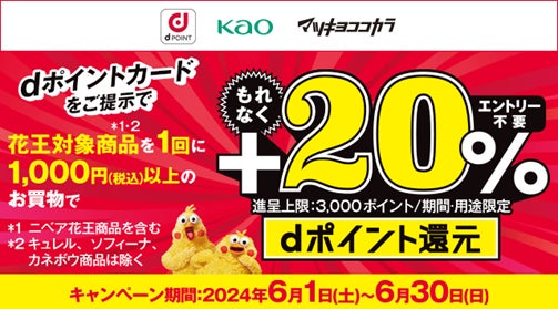 2024/05/31 マツモトキヨシ・ココカラファインにおいて「花王対象商品でもれなく+20%dポイント還元キャンペーン」を開催