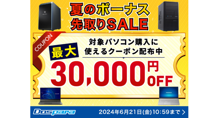 2024年6月7日 【ドスパラ】対象パソコン購入に使える最大3万円引きクーポン配布夏のボーナス先取りSALE 開催