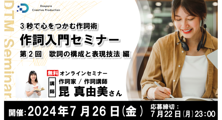 2024年7月12日 【ドスパラ】『作詞入門セミナー』ゲーム感覚で学ぶ第2回 歌詞の構成と表現技法 編 作詞家・作詞講師 昆真由美氏が登壇 7月26日(金) 20時より開催