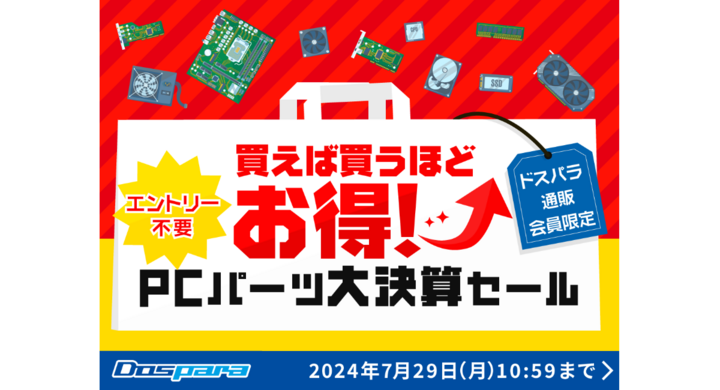2024年7月12日 【ドスパラ】購入個数に合わせて合計金額から値引きになる 通販サイト限定『買えば買うほどお得に! PCパーツ大決算セール』 開催