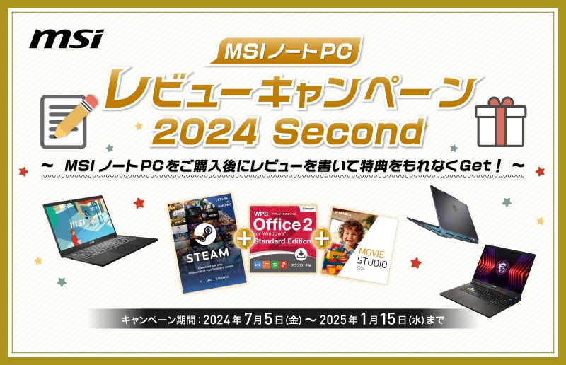 2024年7月5日 対象のMSIノートPC製品の購入で特典がもらえる、2大キャンペーンを開催 『MSIノートPC 20周年記念 プレゼントキャンペーン』『MSIノートPCレビュー投稿キャンペーン 2024 Second』